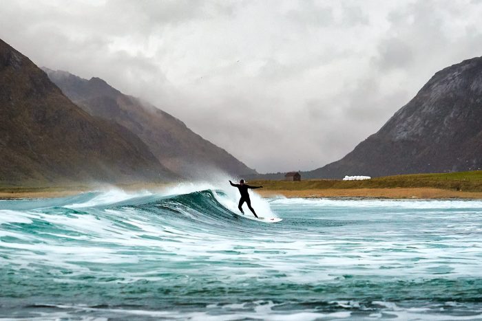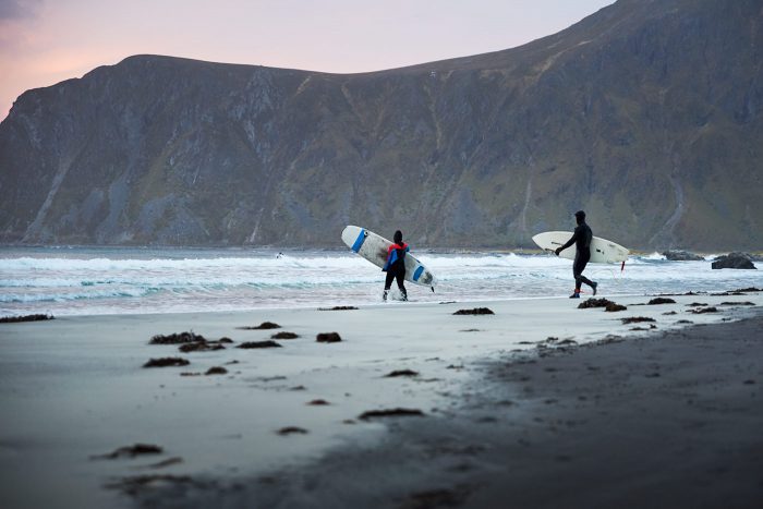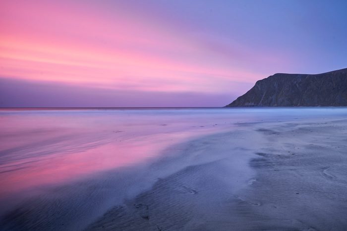 A small secluded beach in Norway’s Lofoten Islands with surfing, amazing sunsets and good viewing of the Aurora.